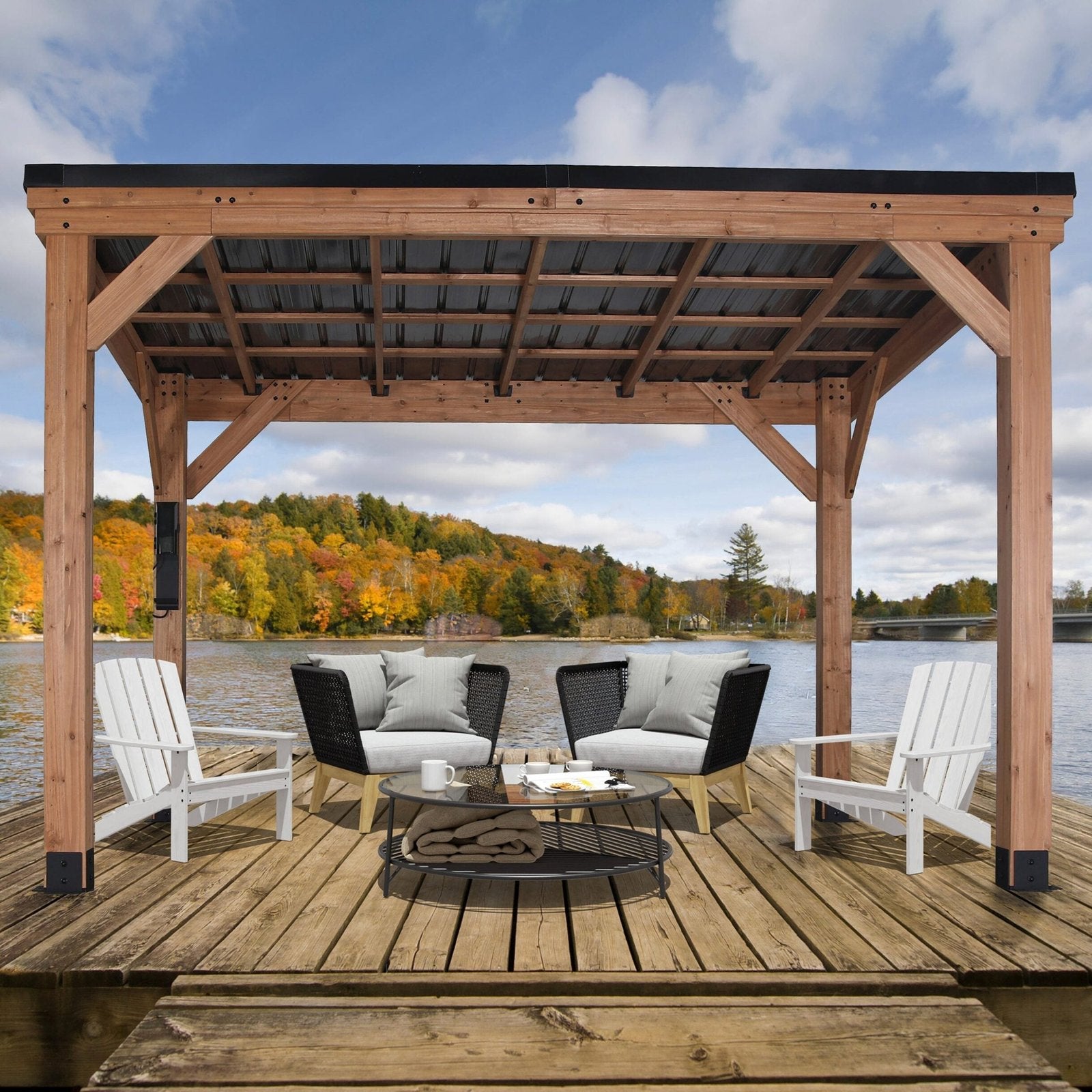 Mix modern design and warm materials with our 12×9.5 Arcadia Gazebo. The clean, contemporary wood and metal look complements any home’s style and gives you enough space to explore a range of possibilities underneath.