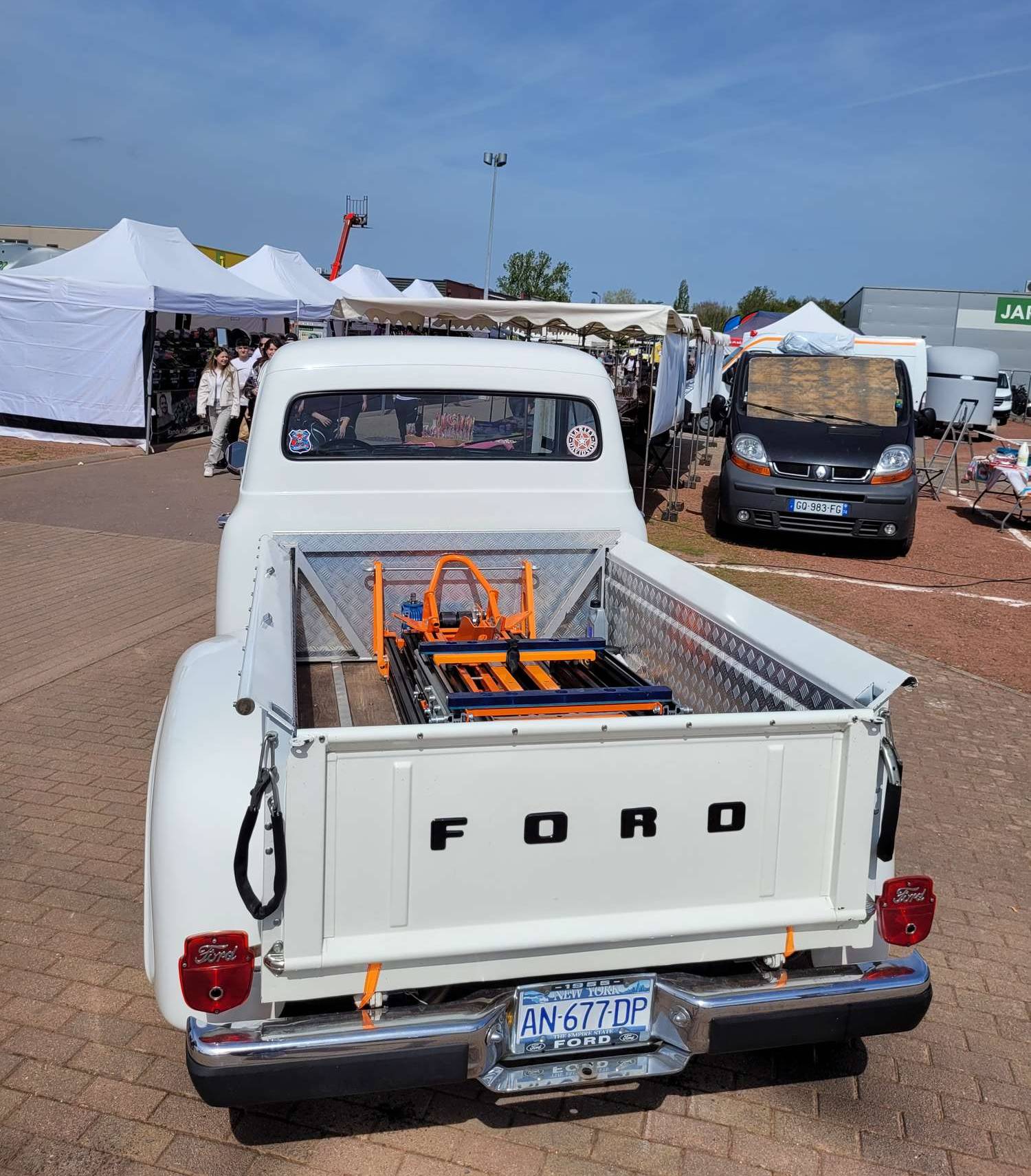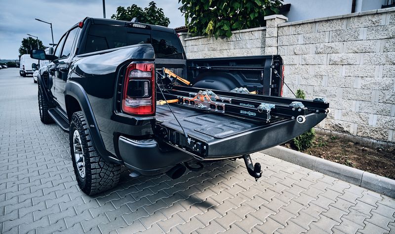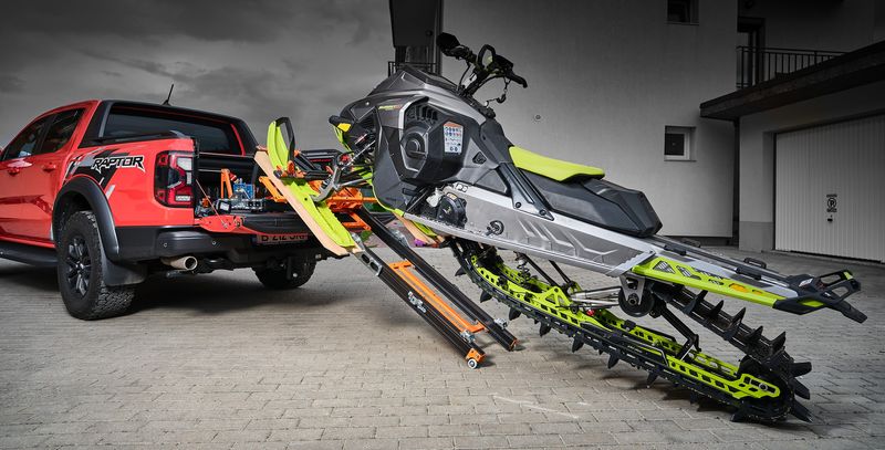 The fold-up ramp is sufficiently long, even for a pickup truck with a relatively high loading height.