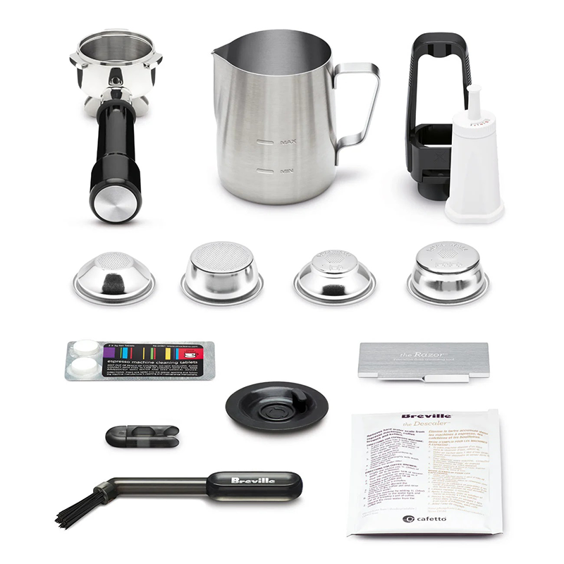 Accessories include a patented Razor™ dosing tool, 1 & 2 cup single and dual wall filter baskets, Coffee scoop, Stainless steel milk jug, Cleaning disc and tablets, Cleaning tools, Water filter holder, steam wand cleaning tool, cleaning brush, descaling powder and is backed by a manufacturer’s 2-year Repair, Replace or Refund Guarantee.