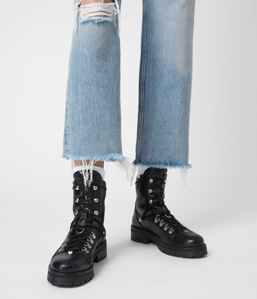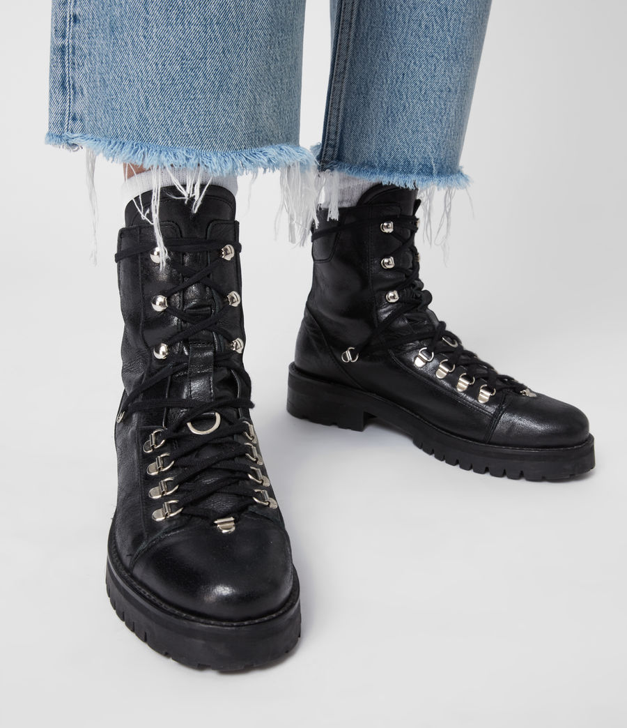 The Franka Boots. They’ve become a fan favourite. Crafted from leather. With metal hiker hardware. Military meets hiking boots. It’s a hybrid. Padded collar Chunky sole Round toe Metal d-rings Metal eyelets Leather pull tab Heel height: 3.8cm Upper: 100% cow leather Sock: 100% pig leather Lining: 100% pig leather Sole: 100% rubber