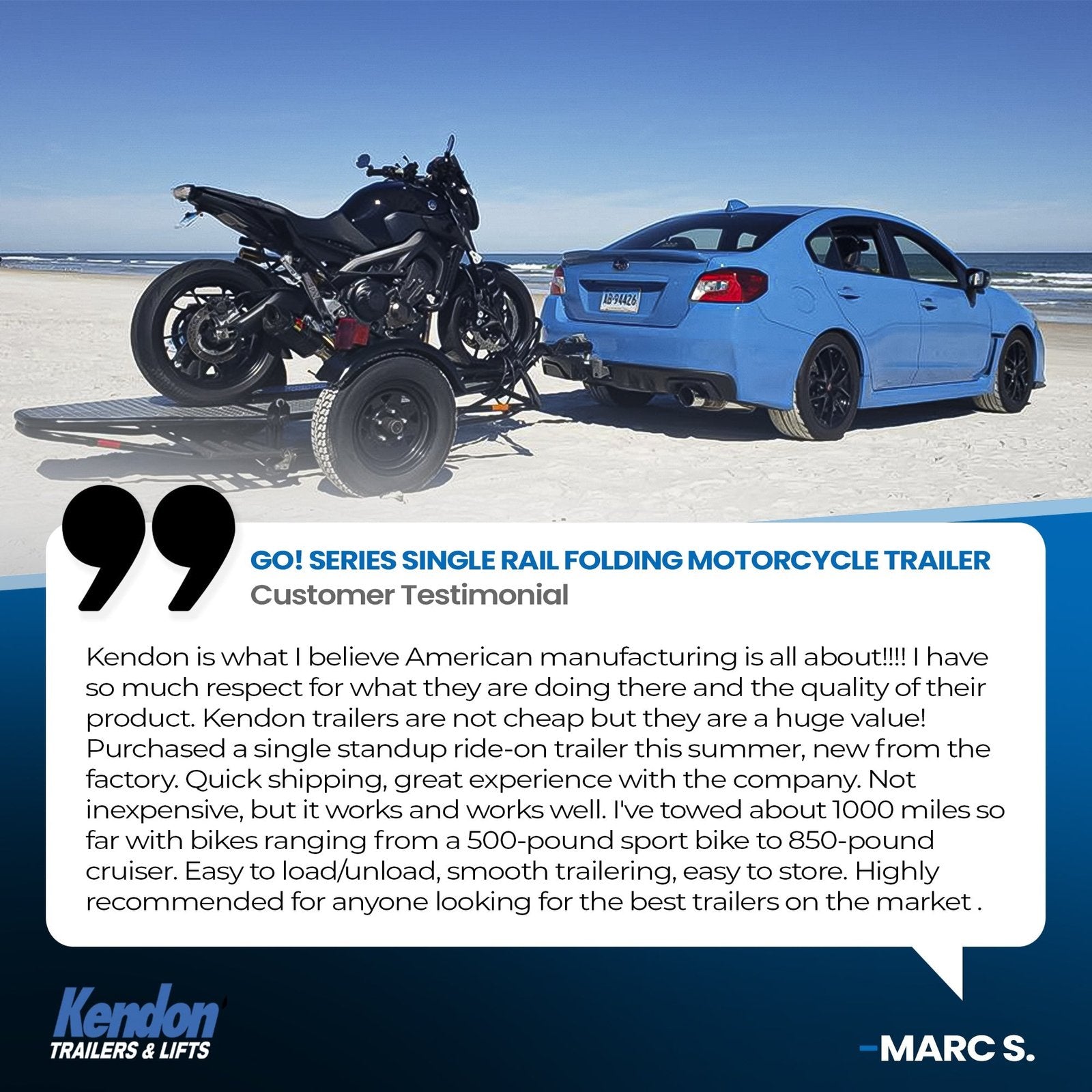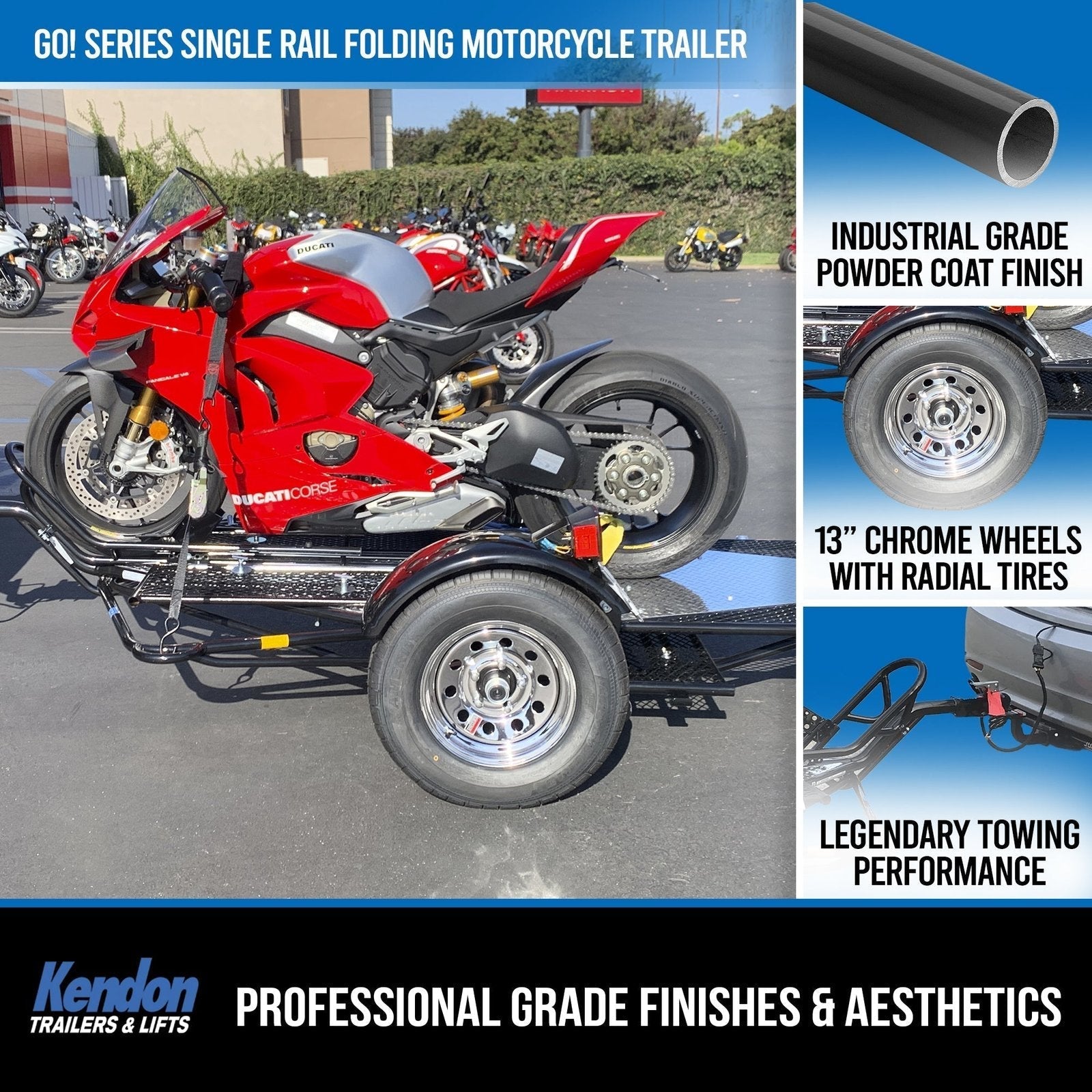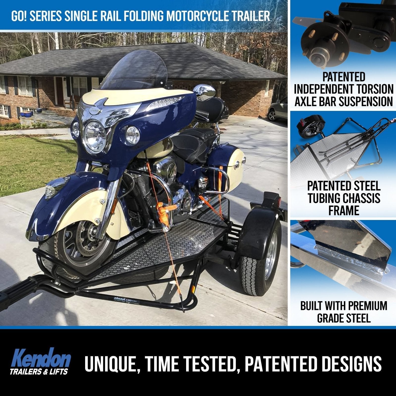 Exceptional performance doesn’t just happen overnight, it’s a product of superior design and many years of testing and refinement. Kendon’s round steel tube construction and triangulated frame geometry is inspired by race car design and engineering. The result is a trailer that is incredibly strong, lightweight, easy to use and even easier to tow. And for you that means a motorcycle trailer that’s easy to stand up and maneuver in the garage.