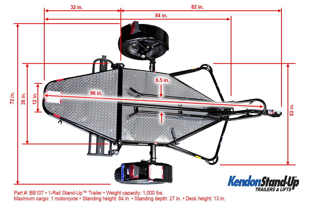 The Go! Series Single Rail trailer can carry one full-size motorcycle or general cargo. Each trailer is equipped with ride-on capabilities plus Kendon’s renowned Stand-Up™ folding feature. Weighing in at 340 lbs. the trailer is easy to maneuver and when in storage, the Go! Single-Rail takes up about the same space as a small bedroom dresser or chest of drawers.