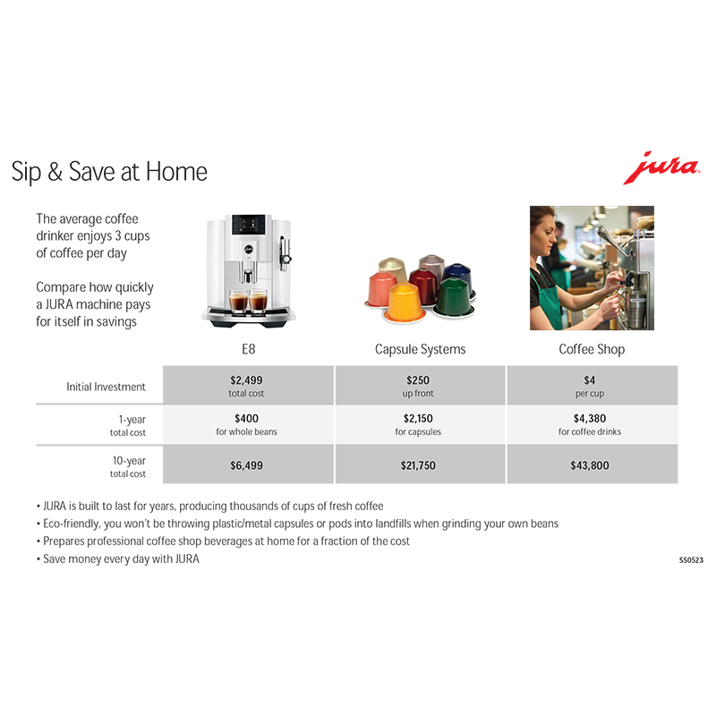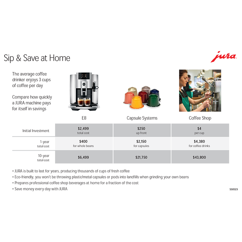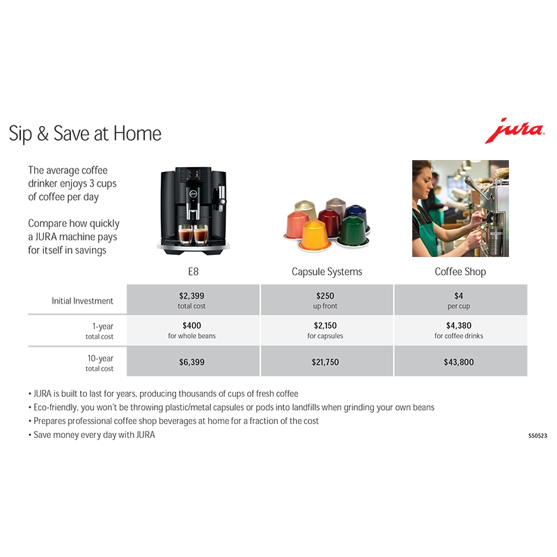 The most successful Automatic Coffee Center in Jura’s history just keeps getting better, in this latest design that packs in all of Jura’s best technology, more specialties at a touch, and a beautiful, updated look. The new Jura E8 Automatic Coffee Center will now prepare 17 programmed specialties including 1 or 2 Espresso, 1 or 2 […]
