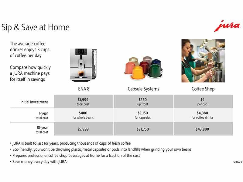 At only 10.7″ wide, 12.7″ high and 17.5″ deep, the ENA 8 is designed to prepare perfect espresso and your favorite espresso-based beverages. Pre-programmed specialties include Espresso, Coffee, Cortado, Cappuccino, Cappuccino Extra Shot, Espresso doppio, Macchiato, Latte macchiato, Latte macchiato Extra Shot, Flat white, Flat white Extra Shot, Portion of milk foam, and hot water for tea or cocoa. Several have a 2-cup option. And of course it’s outfitted with all of Jura’s essential technologies and convenience features, such as Pulse Extraction Process technology, Intelligent Pre-Brew Aroma System, Multi-level AromaG3 grinder, JURA fine foam technology, TÜV-certified automated hygiene systems and so much more. The Jura ENA 8 includes a manufacturer’s 2-year warranty. Measures 10.7″ w x 17.5″ l x 12.7″ h.