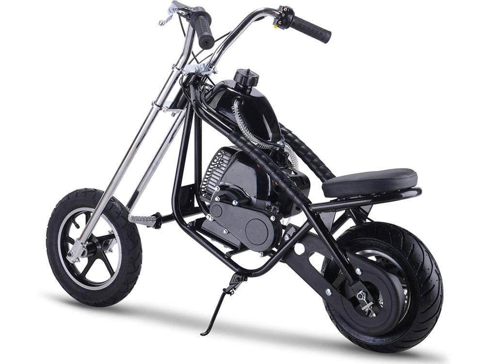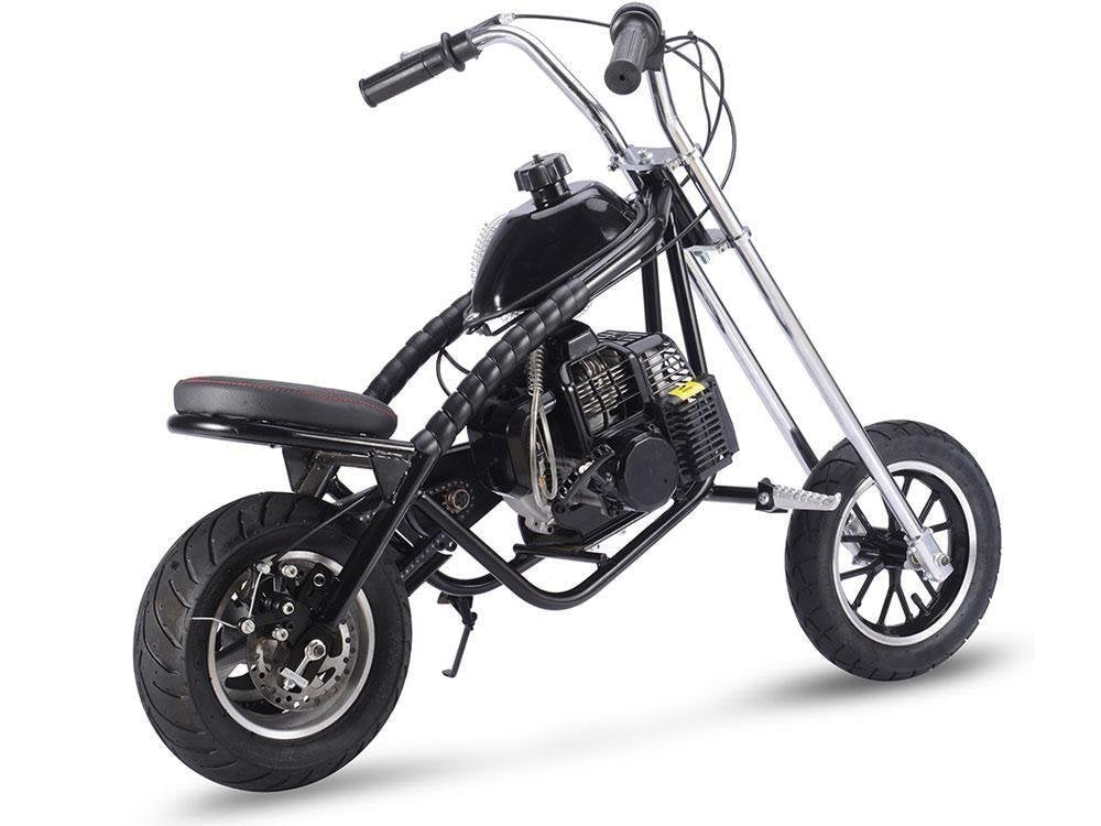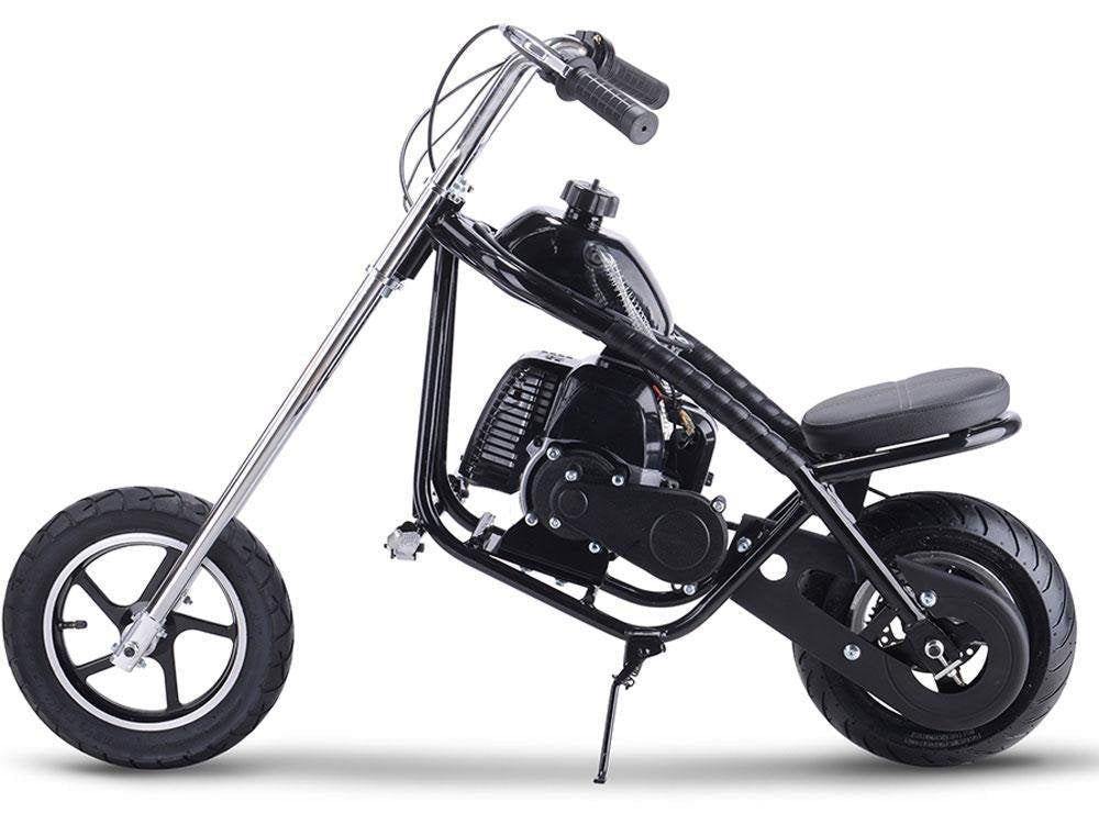 The MotoTec 49cc Gas Mini Chopper is the ultimate kid ride! Great for driveway and a parking lot fun, cruise around cones, and speed through trails with ease. Comes standard with rear disc brakes and large 14-inch front and 11 inch rear pneumatic street tires.