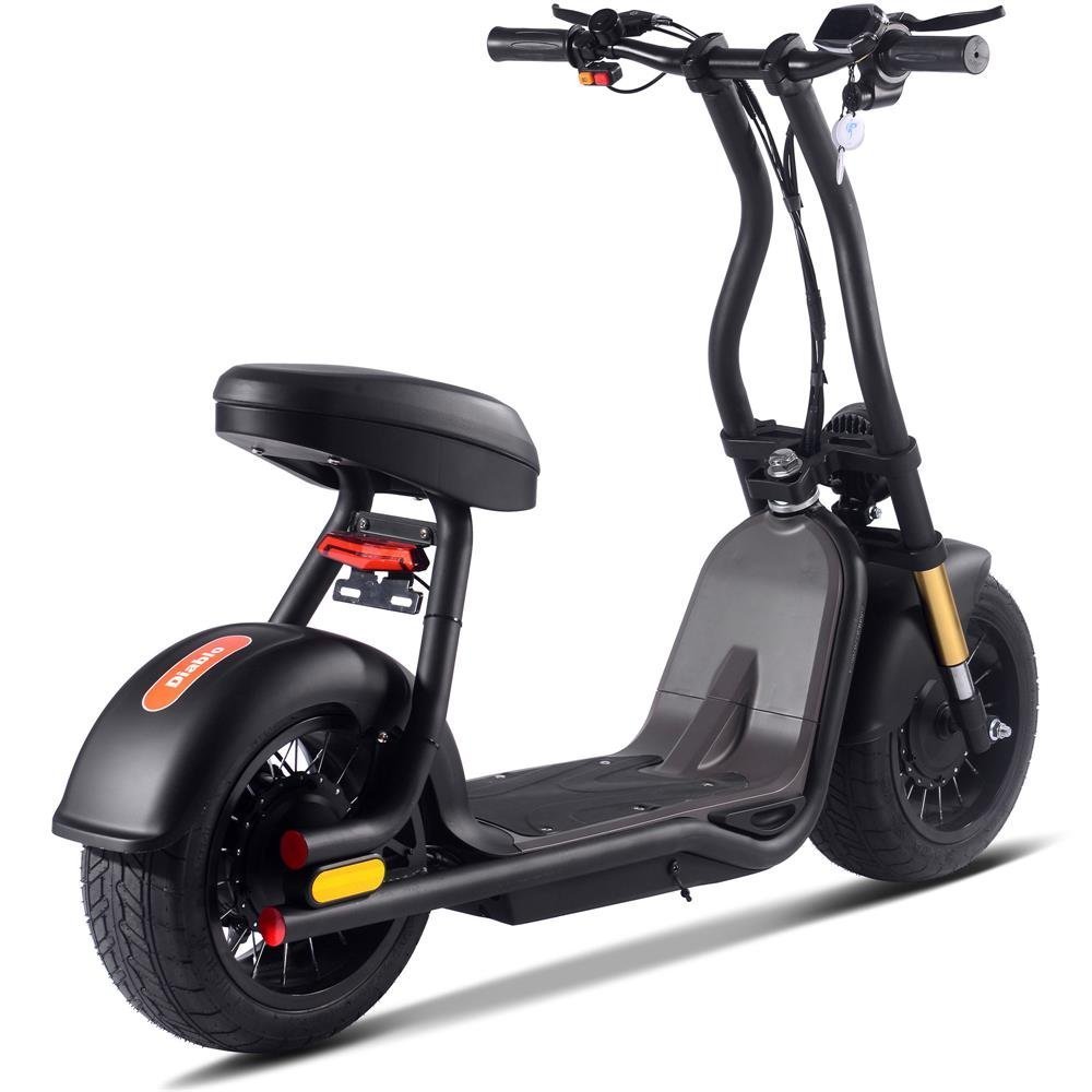 Introducing the new MotoTec Diablo 48v 1000w Lithium Electric Scooter – Black A  Powered Electric Fat Tire Scooter. Ergonomic shapes, large padded seat, LED headlight & brake light, front suspension with large street tires give this scooter a lot of attitude. Comes standard with front & rear disc brakes, key start and battery meter. This top of the line model features a rear hub motor with generous torque and performance, ready to tackle any terrain.