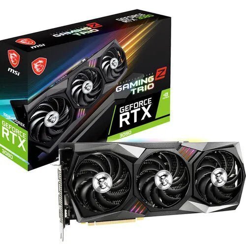 MSI GeForce RTX 3080 GAMING Z TRIO LHR Graphics Card MSI GeForce RTX 3080 GAMING Z TRIO LHR Graphics Card brings the power of real-time ray tracing and AI to your PC games. The GPU features 10GB of GDDR6X VRAM and a 320-bit memory interface, offering improved performance and power efficiency over the previous Turing-based generation. This graphics card is the LHR (Lite Hash Rate) version. The Hash Rate may vary depending on your PC hardware specifications, quality of your internet connection, and/or other factors. The front panel of the card features a variety of outputs, such as DisplayPort 1.4a and HDMI 2.1. HDMI 2.1 supports up to 48 Gb/s bandwidth and a range of higher resolutions and refresh rates, including 8K @ 60fps, 4K @ 120fps, and even up to 10K. The RTX 3080 is not just about high-resolution gaming. Computationally intensive programs can utilize the GPU’s 8704 cores to accelerate tasks using CUDA and other APIs. For cooling, MSI implemented triple TORX FAN 4.0 fans. The fand blades are bound together with a linked outer ring design that focues on airflow. With RGB Mystic Light, you can customize colors and LED effects with exclusive MSI software and synchronize the look and feel with other MSI components. NVIDIA Ampere Architecture NVIDIA Ampere is the 2nd generation RTX architecture. It features up to twice the FP32 throughput, 2nd Gen RT Core throughput, and 3rd Gen Tensor Core throughput of the previous generation. It also features a Samsung 8N custom process and utilizes GDDR6X VRAM. Real-Time Ray Tracing The NVIDIA GeForce RTX platform enables real-time ray tracing of objects and environments with physically accurate shadows, reflections, refractions, and global illumination. DLSS NVIDIA DLSS (Deep Learning Super Sampling) is AI rendering that boosts frame rates while still providing optimal image quality using the dedicated AI processing Tensor Cores on the GeForce RTX platform. This gives you the performance you need to maximize ray tracing settings and resolutions for an immersive visual experience. HDMI 2.1 The HDMI 2.1 interface provides increased bandwidth, allowing a single cable to output to 8K HDR TVs for ultra-high-resolution gaming. Brands MSI GPU GPU Model NVIDIA GeForce RTX 3080 Stream Processors 8704 CUDA Cores Boost Clock Speed 1830 MHz Interface PCI Express 4.0 x16 Supported APIs DirectX: 12OpenGL: 4.6Vulkan OS Compatibility Windows*As of June, 2022: Check with manufacturer for the most up-to-date compatibility Memory Memory Speed 19 Gb/s Memory Configuration 10 GB Memory Interface GDDR6X Memory Interface Width 320-Bit Memory Bandwidth 760 GB/s Display Support Display I/O 3 x DisplayPort 1.4a1 x HDMI 2.1 Maximum Digital Resolution 7680 x 4320 Power Requirements Max Power Consumption 370 W PCI Power Connectors 3 x 8-Pin Recommended System Power Requirement 750 W Dimensions Expansion Slot Compatibility Full Height Height 5.5″ / 140.00 mm Length 12.7″ / 323.00 mm Width 2.75-Slot General Cooler Type Open Fansink with Three Fans Lighting RGB LED Packaging Info Package Weight 5.21 lb Box Dimensions (LxWxH) 16.3 x 12.1 x 3.5″