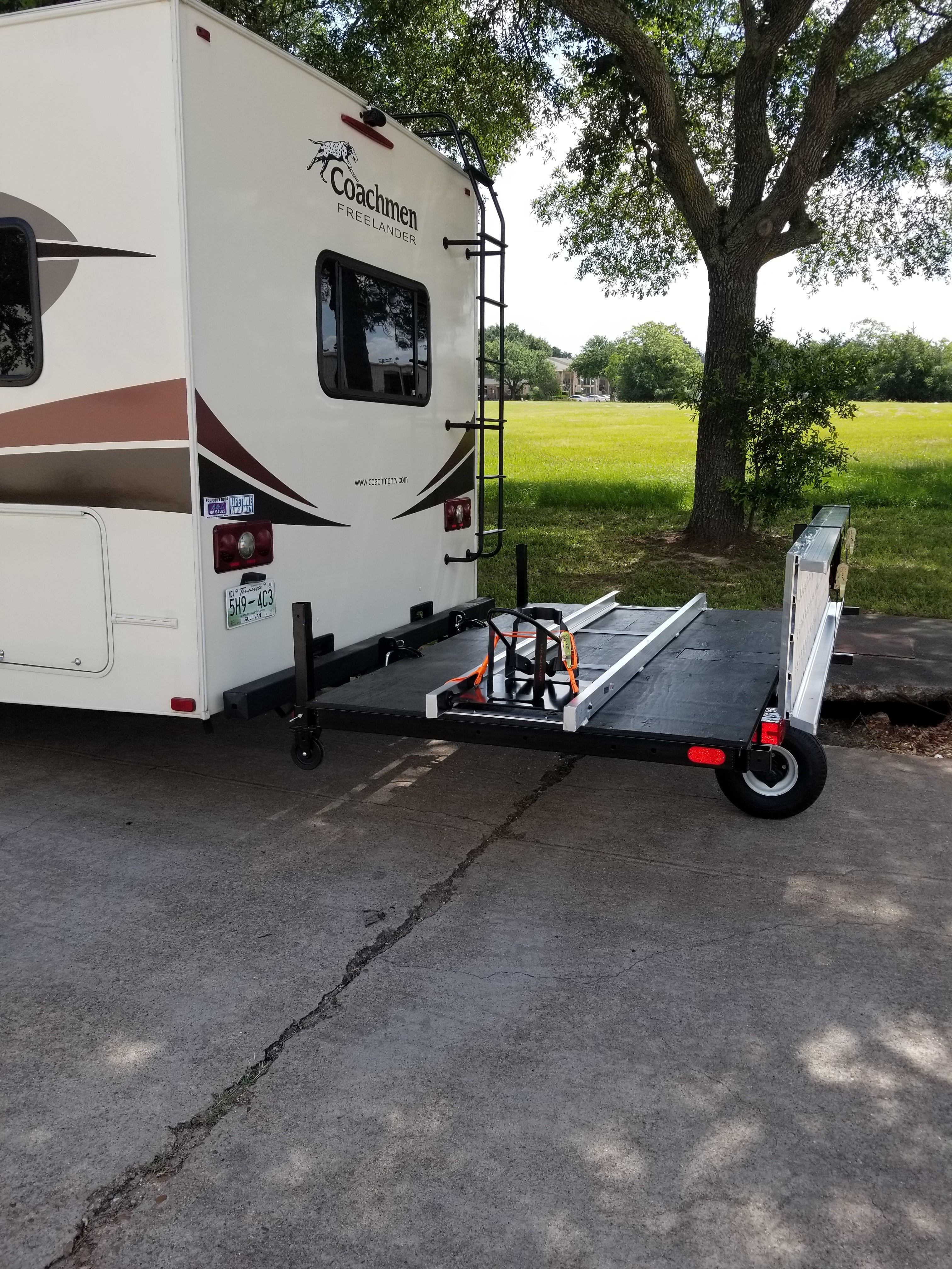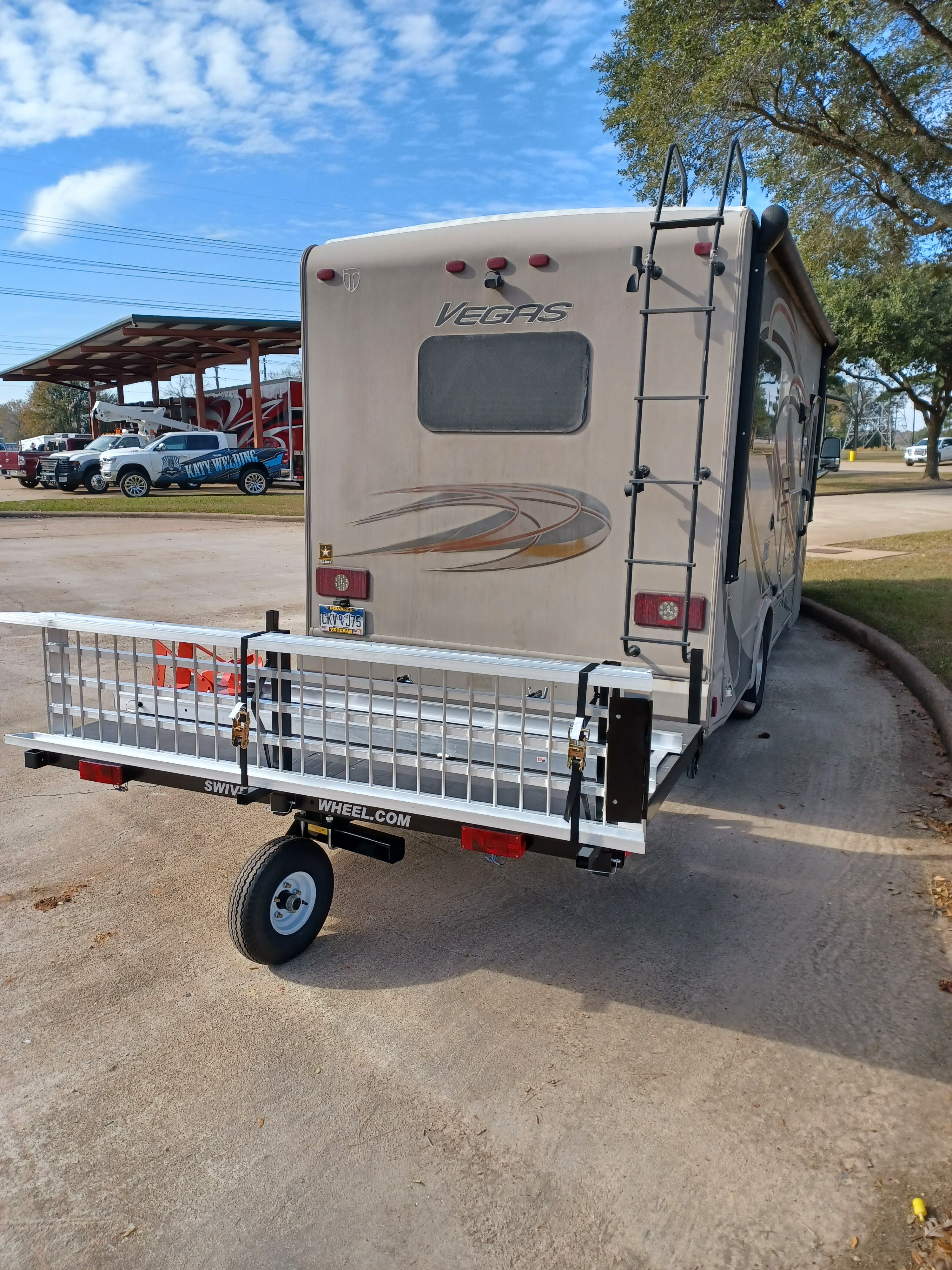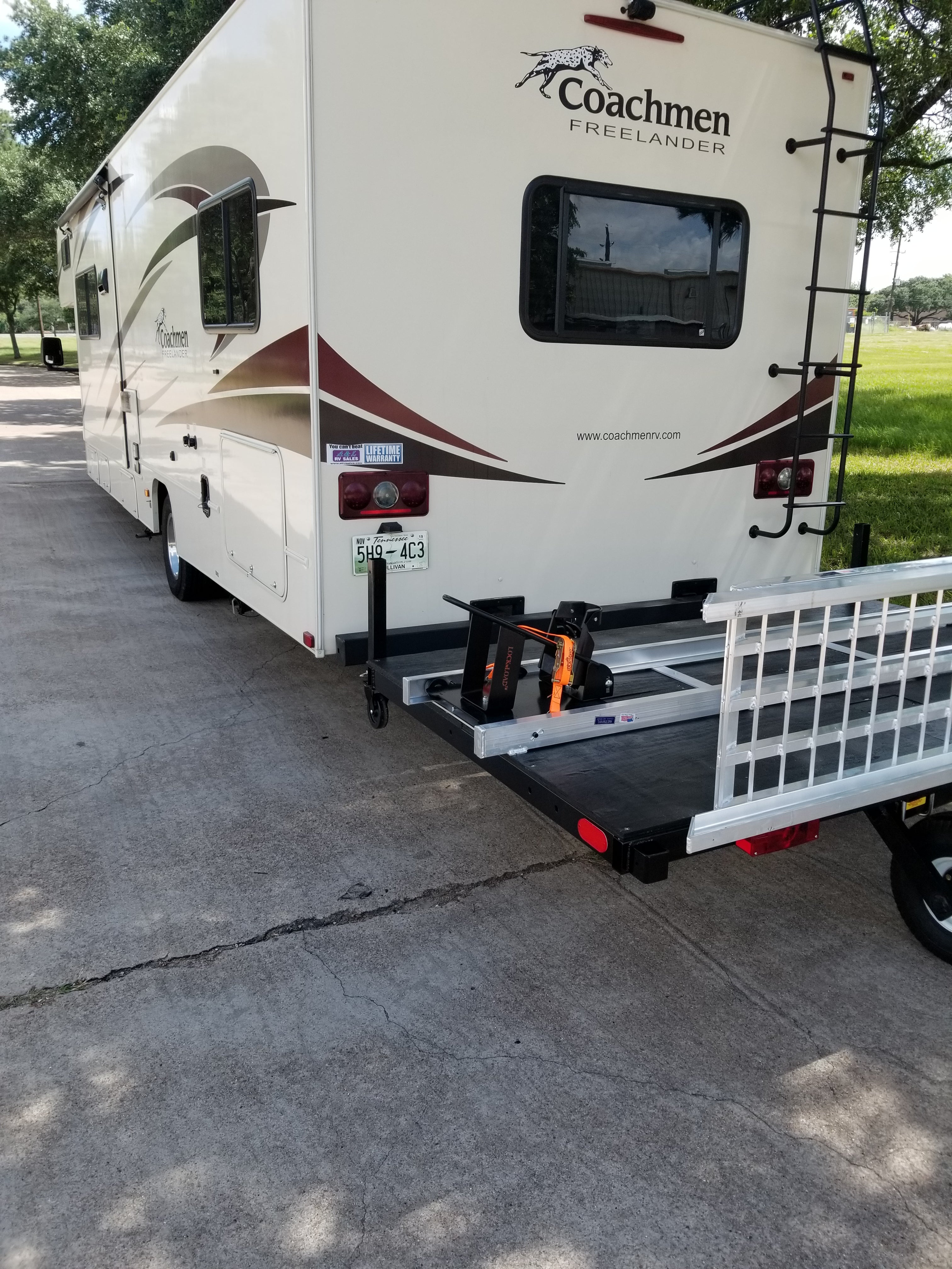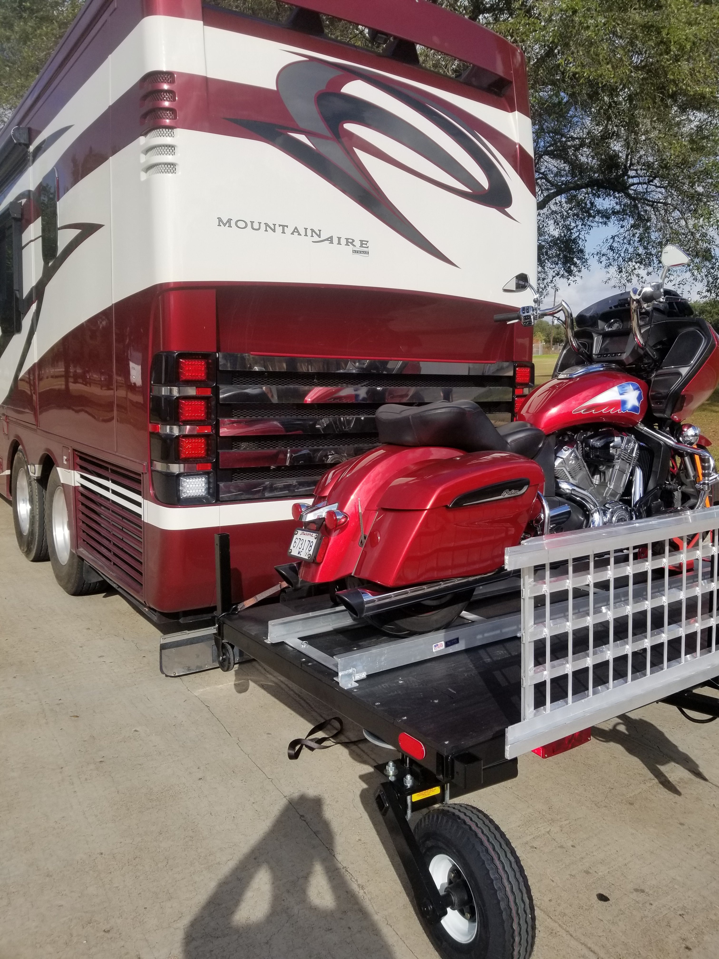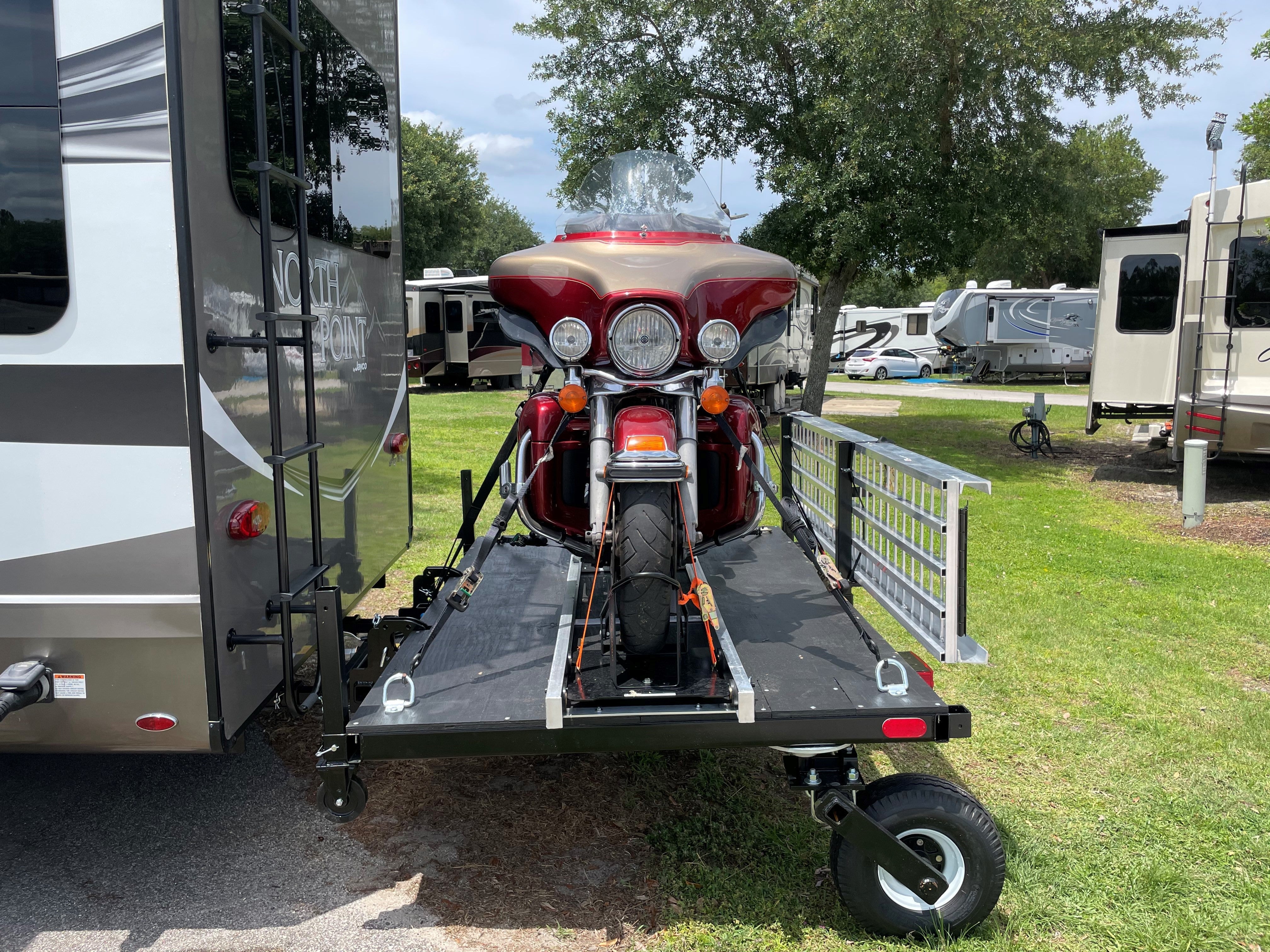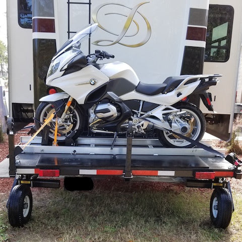 This option is an inexpensive way to load your bike without having to use a winch and having to draw power from your fifth wheel or motor home. The motorcycle is the power source. No more worrying about balancing when loading your motorcycle.