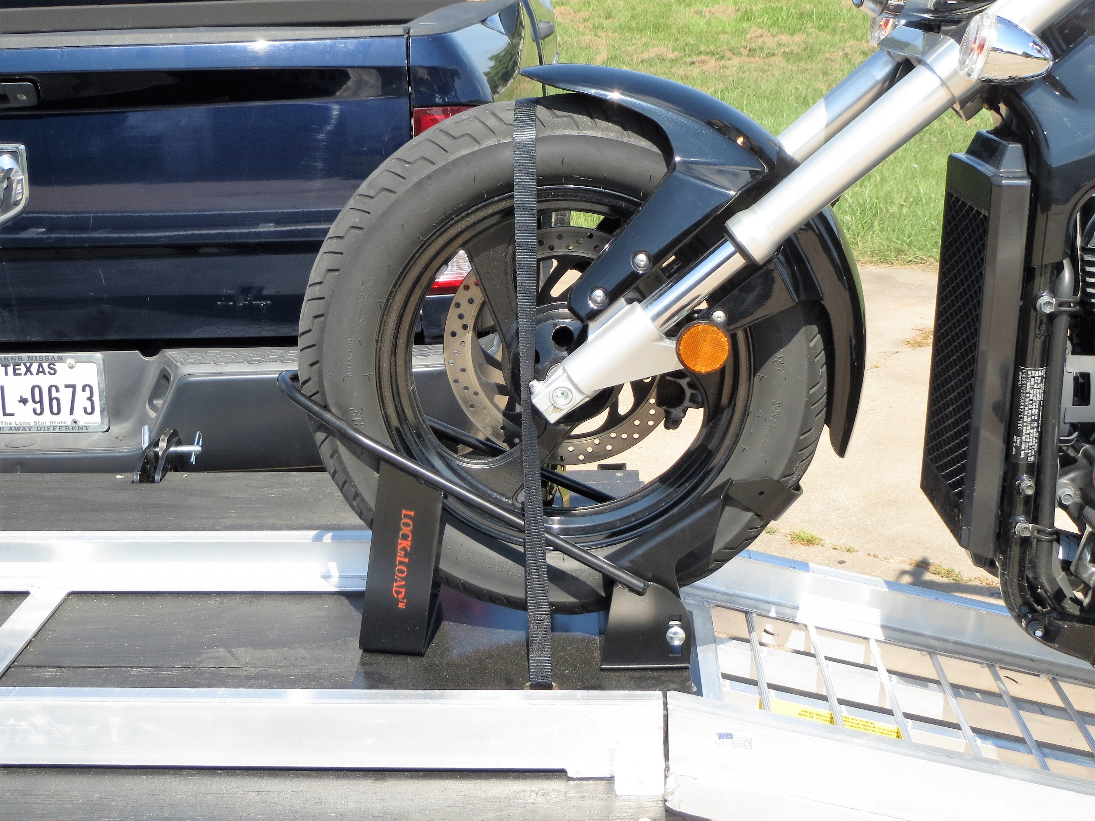 The Power Ramp uses a channeled ramp with a bed guide mounted to the deck of the Swivelwheel system. Once the bike is locked into the trolley you just slowly clutch the Motorcycle up. For an example of the loading process  (See video below).