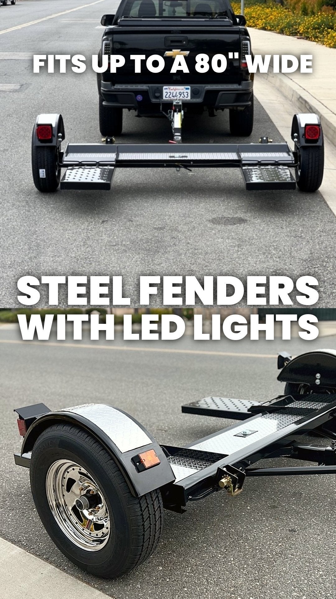 Durable tilt-down ramps makes loading simple enough to be handled by one person. Attaching and detaching the unit to any RV or truck is made easy by its standard trailer handle (welded near the coupler). This car tow trailer does more than just look good: it provides the safest, easiest, smoothest towing experience on the market. It makes towing look like an art form and lets you master the art of towing within minutes. Its quick-lock ratchet system and included safety chains provide the highest level of security for maneuvering auto transport dolly. With features like its steel ramps and an extra-wide wheel base, the Black & Chrome Tow Dolly will help you safely tow your car with ease. The Black & Chrome Tow Dolly is noted for its smooth ride and stability with a tongue weight of up to 800 lbs and GVWR of up to 3500 lbs. This combination ensures your vehicle is secure and can handle all terrain conditions. Enjoy easy installation with the included safety chains. With the included turn signals, brake lights, and license plate bracket, you can feel confident you’re always in compliance with the law. Get peace of mind – the Black & Chrome Tow Dolly has you covered.