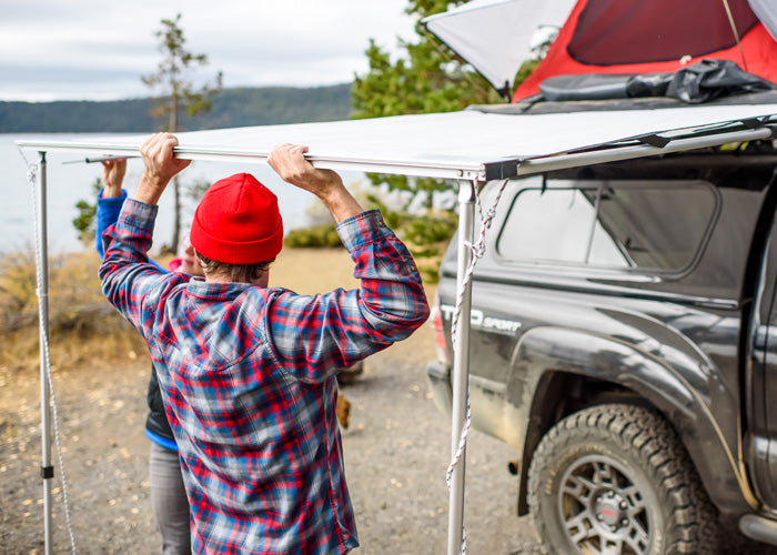 Made for the shade, this awning delivers excellent protection from searing sun and sudden showers. It mounts quickly and easily to the side of your base rack and only takes up six inches of bar space so it won’t crowd your kayaks, cargo boxes, or bikes. It’s super easy to use – just pull it out window-shade style and insert the poles when you get to camp. The light, strong nylon canopy has a waterproof PU coating to shed rain and delivers 42 square feet of shady coverage on summer days. Universal mounting hardware fits most roof racks.