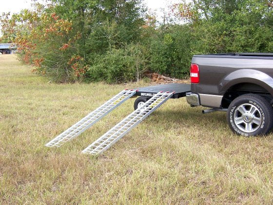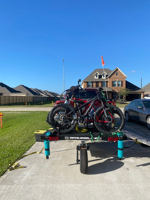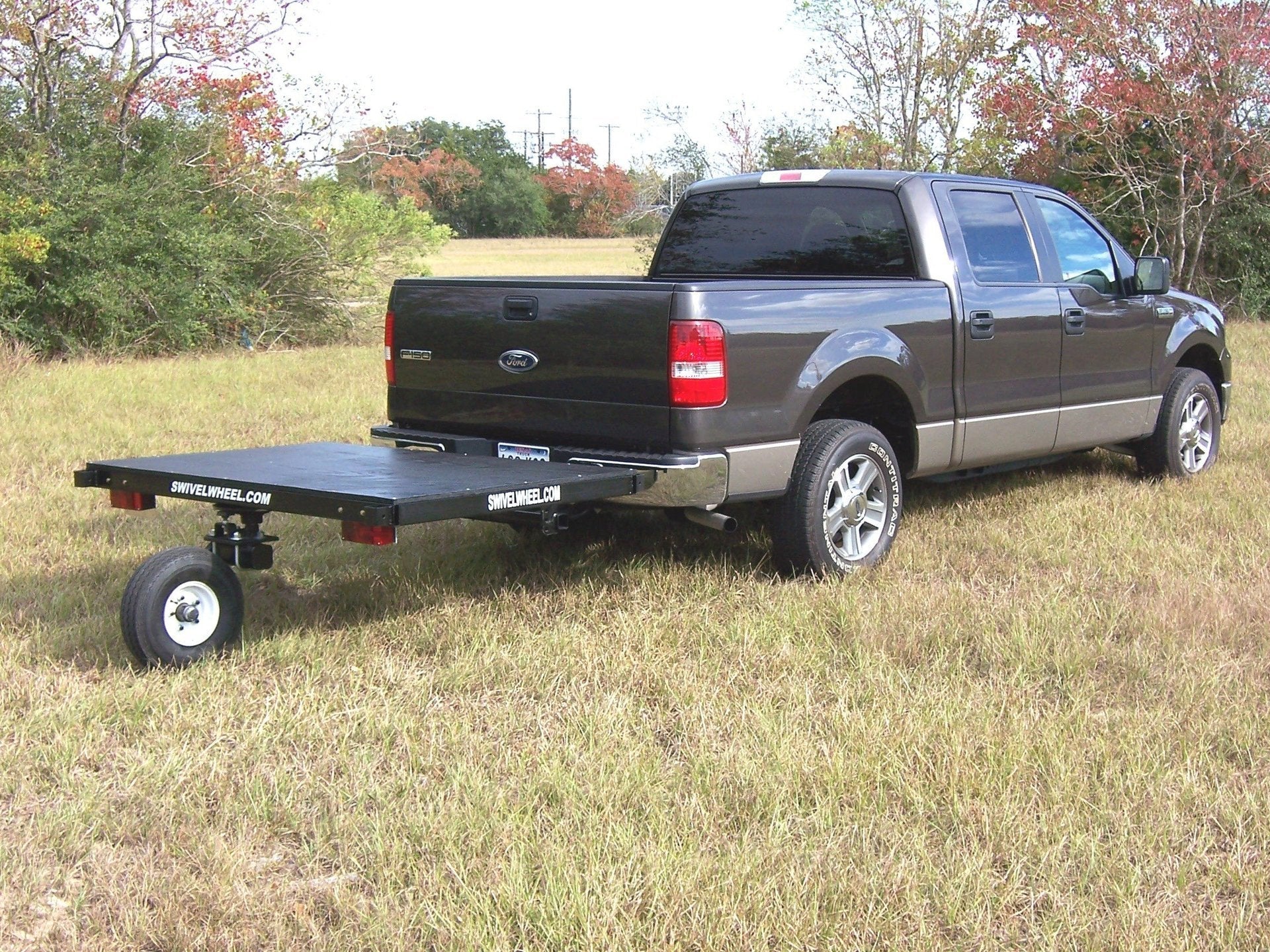 The Swivelwheel-46 System has a deck dimension of 6 ft wide x 4 ft long. There is a weight capacity of 600 pounds with the system. This system is great for transporting Motor Scooters, Dirt Bikes, small ATV’s, etc. The Swivelwheel-46 system may also be loaded from the rear or from the sides. The tailgate on the pickup may be lowered with the Swivelwheel system attached. All Swivelwheel systems incorporate regulation DOT lighting with a 4-wire flat trailer plug. The single point hitch bar is standard with the SW-46 and you also have the ability to option out for the dual hitch bar for heavier loads to have better stability.
