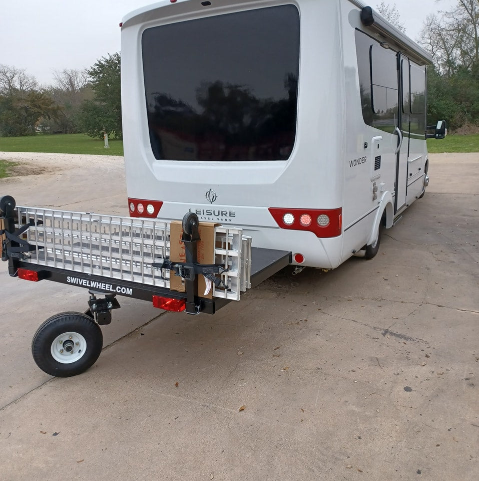 The Swivelwheel transport system uses a caster wheel system. The Swivelwheel is compatible with fifth wheel trailers and motor homes (Class A, B and C) That have a Class III Receiver or more.