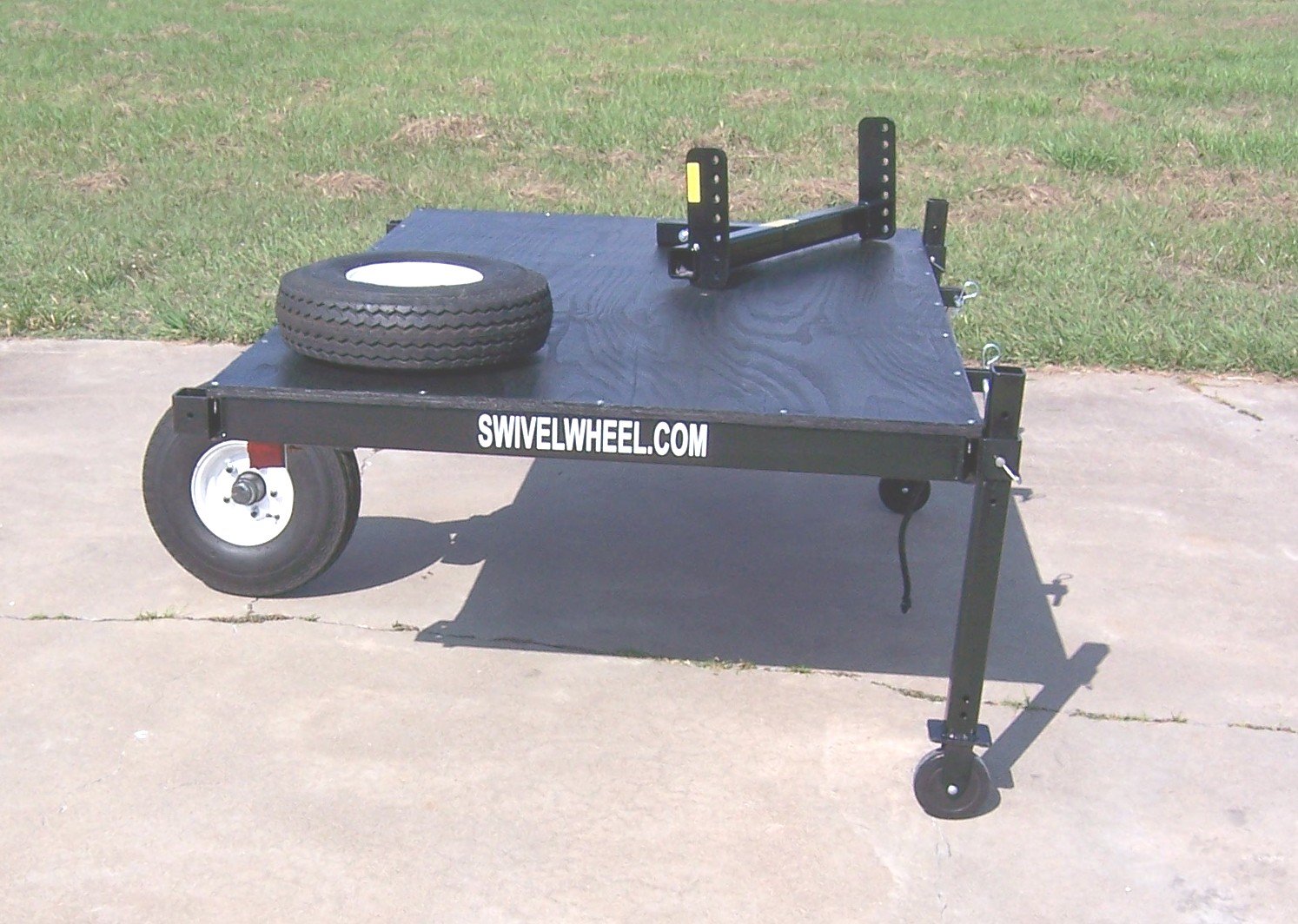 The swivelwheel systems incorporate a torsion suspension, which is a proprietary product designed by Fast Master Products Inc. The wheel assemblies utilizes a 5.70-8 C 6 Ply which are highway rated tires. The front deck height on all Swivelwheel Systems are adjustable to accommodate the receiver height on the tow vehicle.