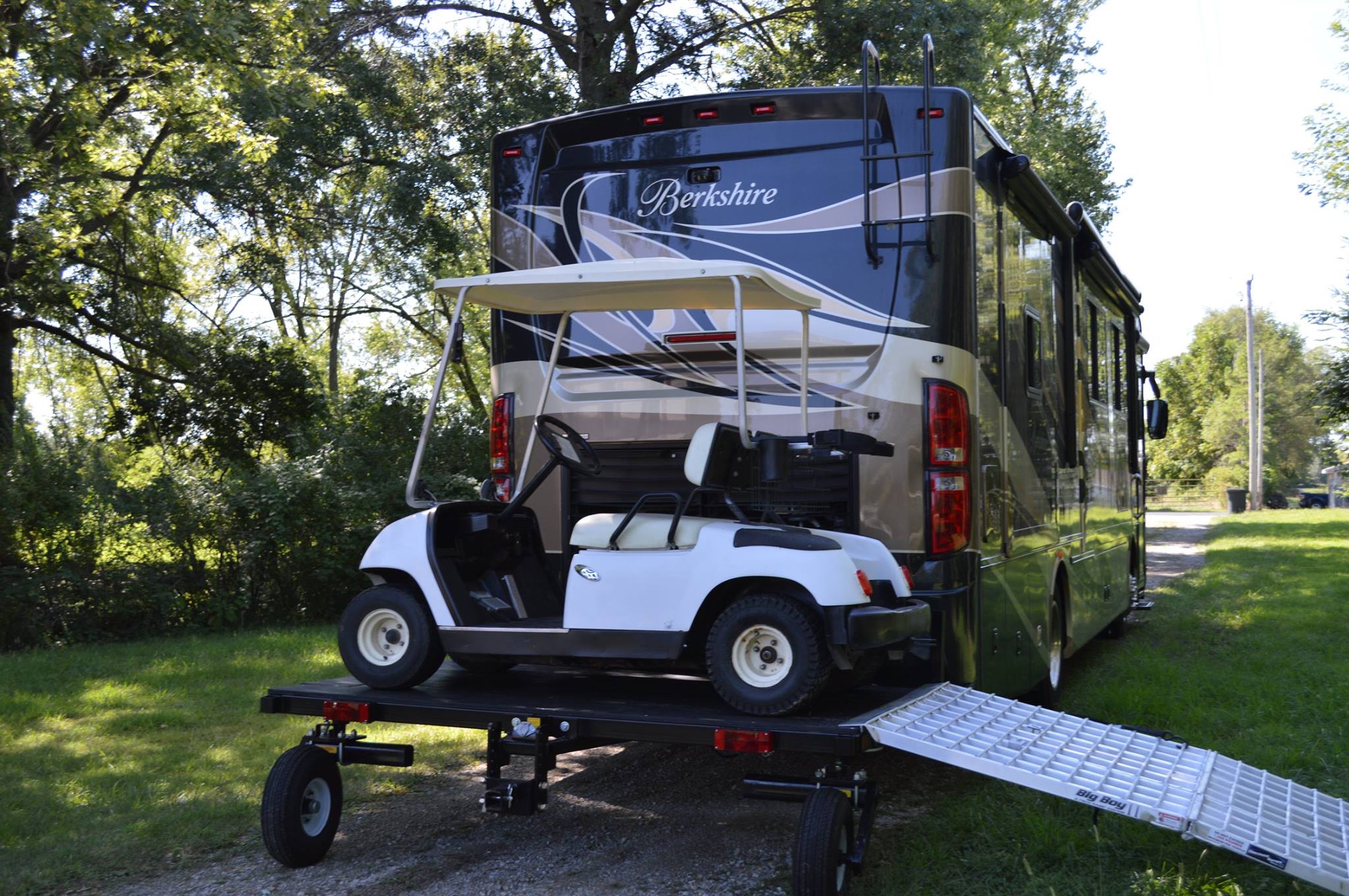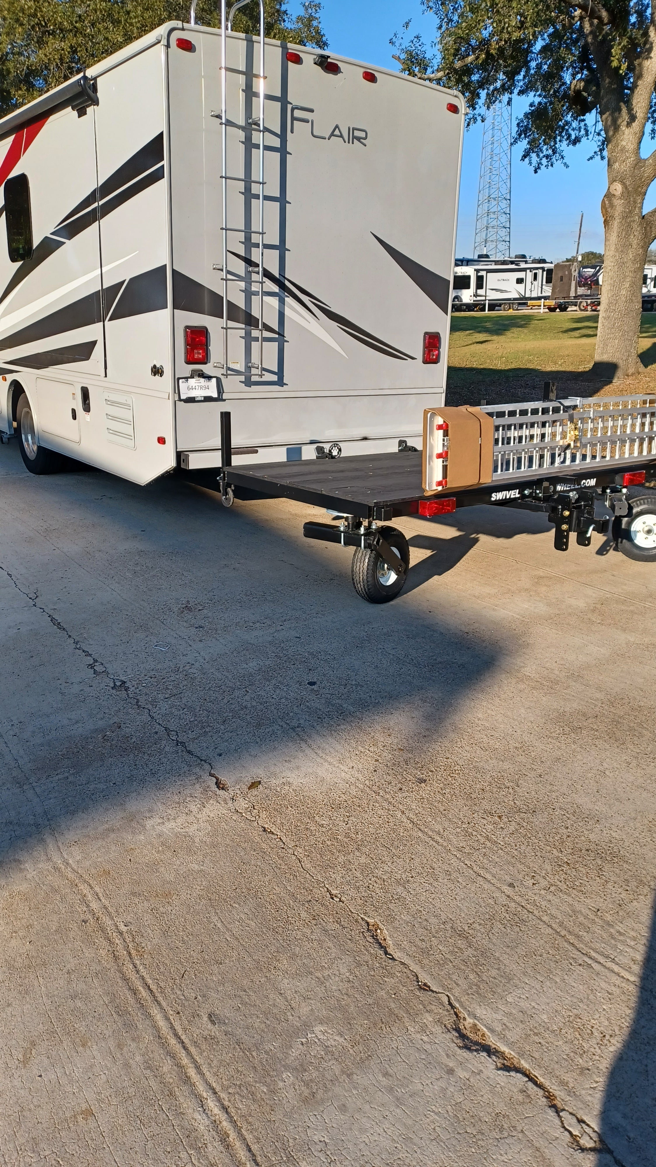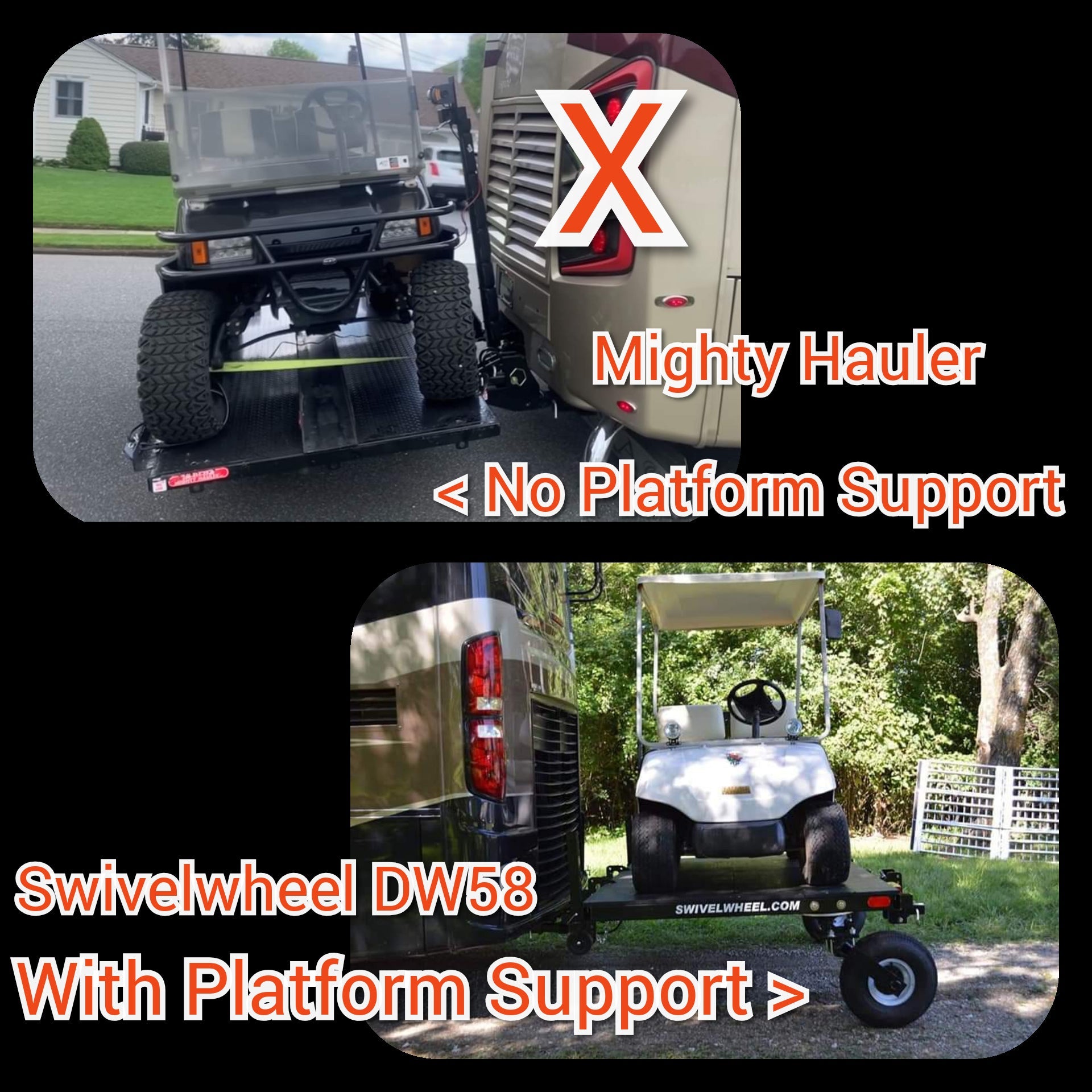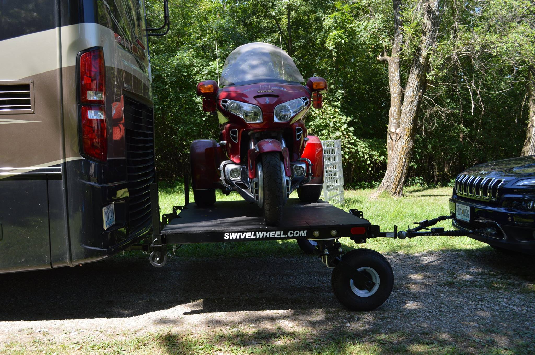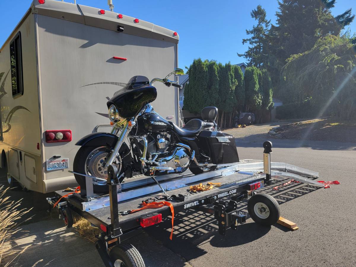 The DW58 Tandem Tow was designed for all Class A & C Motor Homes since it tows a vehicle. There are only a small percentage of class a gas coaches ( front engine ) that can handle a motorcycle lift, this is one reason the Swivelwheel systems were designed in the first place. It takes the stress off the rear of the coaches with minimum tongue weight, with the suspensions you get support so no bouncing. unlike a lift the Swivelwheel DW58 Tandem Tow is very versatile and can carry multiple types of motorcycles, golf carts, Trikes ETC.