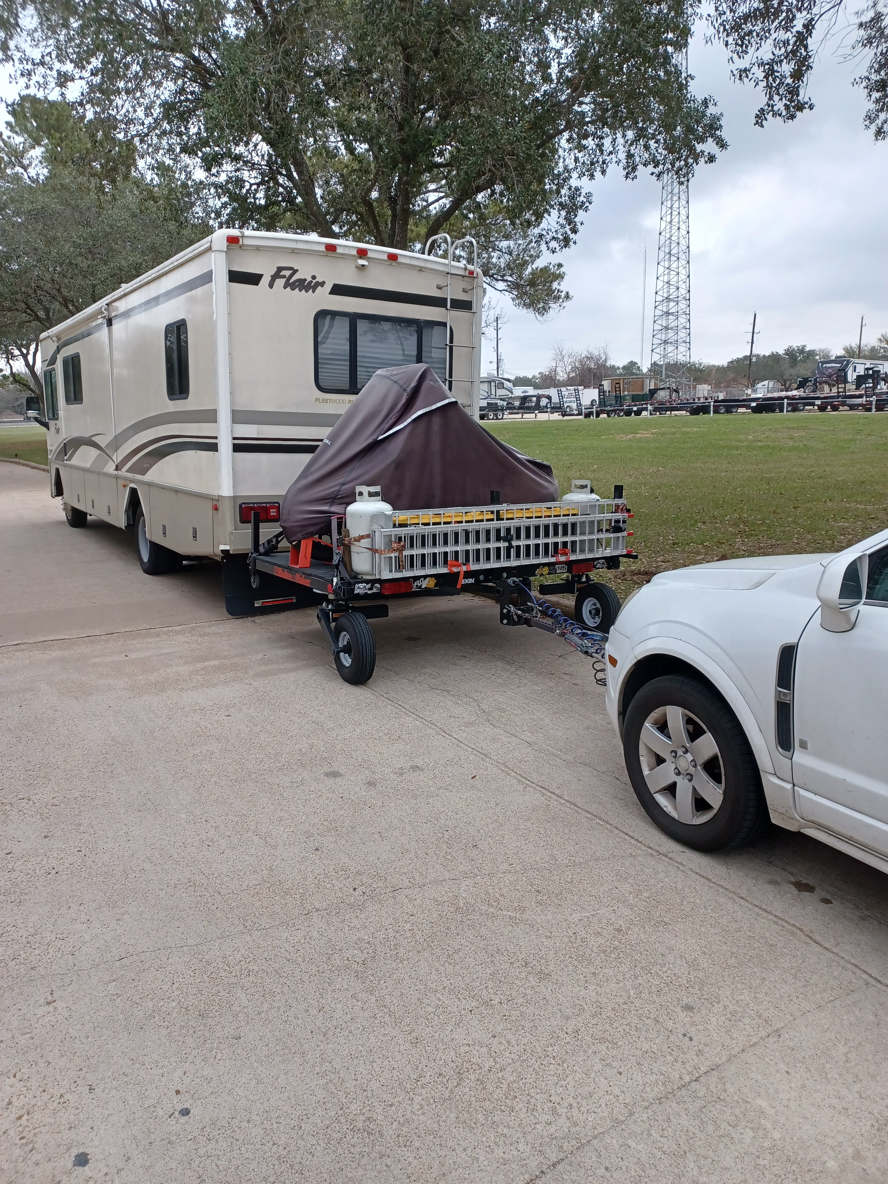 The Tandem Tow system is not meant for Fifth Wheels, look at the DW58 Carrier / Hauler for that purpose. The tow Vehicle must be towed with all 4 wheels on the ground and have a breaking system.