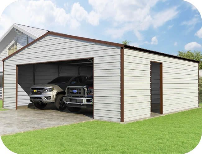 SpecificationsColor: Please Select Desired Color BelowStyle: GarageUsage: Two VehicleFrame: 2″ x 3″ 14 and 15 gauge galvanized steel tubingRoof, Sides and Back: 29 gauge steel panels, 3:12 roof pitchSize: 24′ Width x 24′ Length x 9′ Side Wall Height (11′ 6″H Center)Height Measurements: 11′ 6″ Center Height, 9′ Side Wall Height (Approximately 9′ Ground to Truss Clearance)Frame Measurements: the actual Frame is 24′ longGarage Door Opening Measurements: 16’W x 7’H (Door Not Included)Side Door Opening Measurements: 36″W x 80″H (Door Not Included)Snow Load Rating: 33 lbs per square footWind Rating: 115 mph wind loadWeight: 3218 lbs.Delivered Pallet Size: 40″W x 144″L x 16″HShipping Method: Shipped via Motor Freight Only, Tailgate Curbside Delivery, Liftgate available for an additional fee. *We recommend customer to have 2-3 people to help unload if not ordering liftgate or fork lift service.