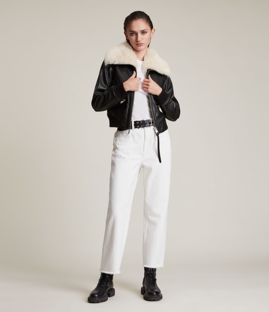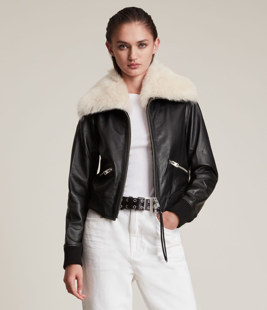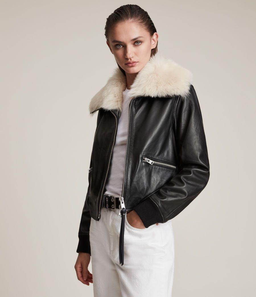 The Wisley shearling black leather jacket is crafted from leather with a statement toscana shearling collar. Ribbed trims and two zip pockets keep things authentic.